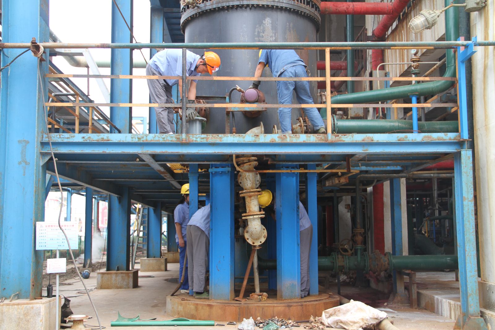 22日凌晨0:00,电解开始降电流,至早晨7:30系统全部停车,检修工作全面铺开。期间,各单位有组织、有计划地进行检修,按照检修方案要求,统一指挥,统一协调,确保检修进度和质量,注意节约,注重环保,确保安全顺利的完成检修任务。此次检修,化工分公司完成盐水换热器改造、中间槽碱泵迁移、液氯贮槽单体贮槽年检、电石料仓顶分料皮带卸料方式改造,7℃水15℃水系统改造等282项检修项目,热电公司完成锅炉水冷壁检查修补、煤气系统检查维护、煤泥系统改造等18项任务,水泥公司完成浓缩机溢流堰找平、直泄筛入料管线改造等8项检修任务。各检修项目通过三级验收,检修工作消除6项A/B级隐患,将大大提升了设备健康水平,为装置长周期安全运行提供了保障。