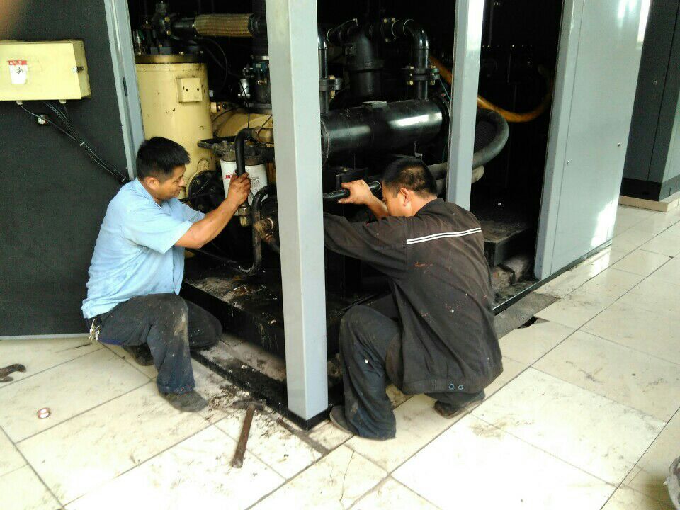 图为该矿运转工区维修工在对压风机冷却器修复。