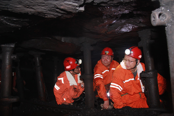 上午九时许,李总一行到矿立即换衣服下井,深入2703薄煤层工作面检查指导工作。在长近130米、平均厚度不足1米的工作面,李总一行一边蹲行一边详细了解工作面生产组织开展情况,并要求干部职工一定要做好本职工作、抓好安全生产。