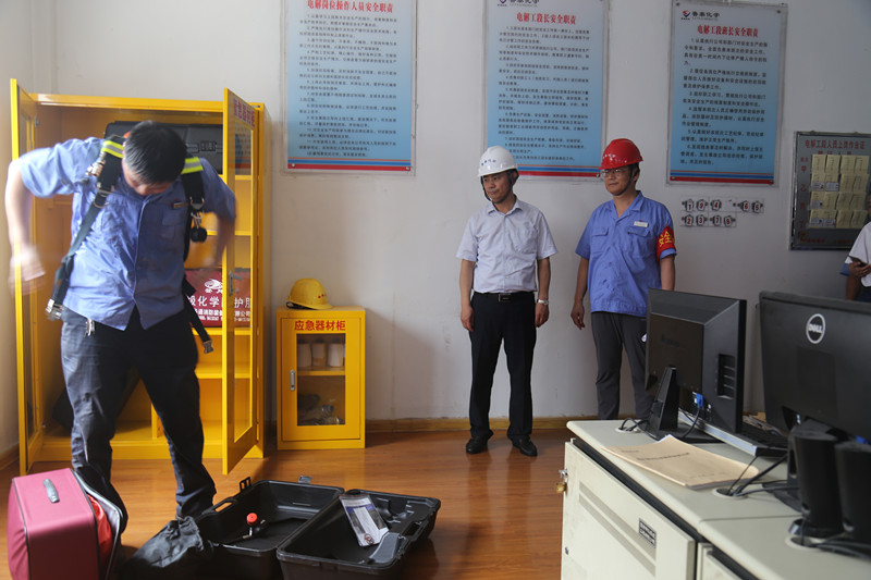 执法检查组听取了公司安全生产工作情况汇报,对公司贯彻落实《安全生产法》、《山东省安全生产条例》的情况进行了实地检查,在电解主控室抽查了员工对应急器材的使用情况。马青山指出,企业要围绕贯彻实施"一法一条例",强化落实主体责任,加大安全投入,加强应急队伍建设,抓好应急演练。